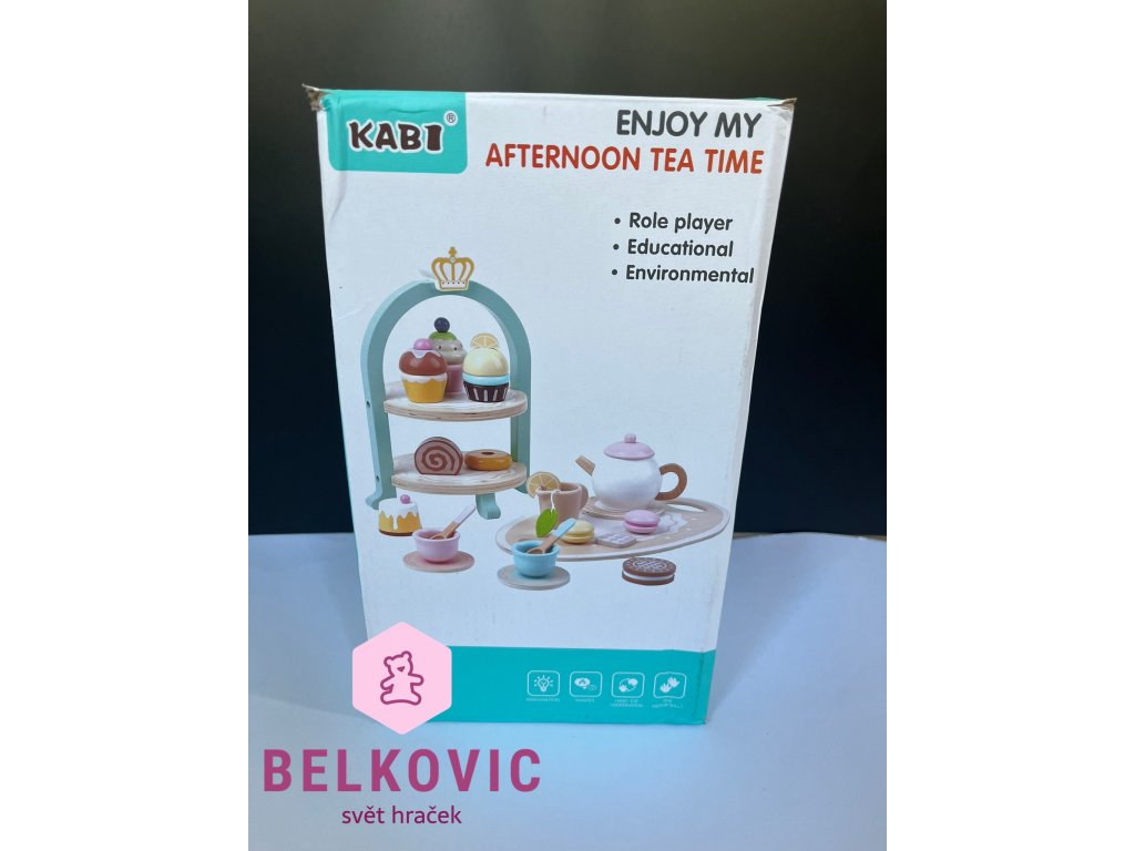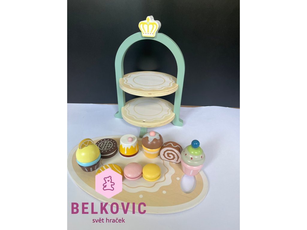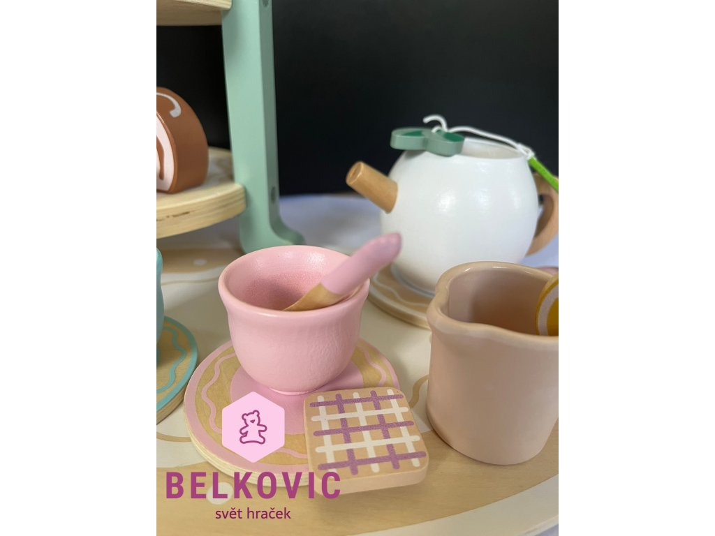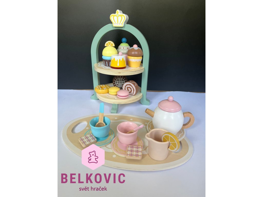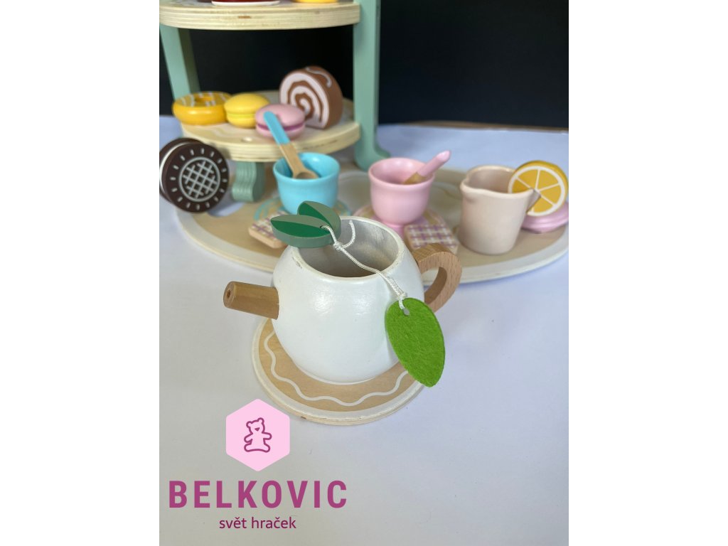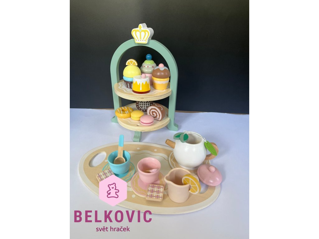 Součástí setu je konvička s víčkem, hrnečky, lžičky, talířky, cukřenka, smetánka, dřevěné dezerty a dvoupatrový stojan s korunkou. Děti si mohou hrát na malé cukráře, pořádat čajové dýchánky s plyšáky nebo servírovat zákusky celé rodině – fantazii se meze nekladou.