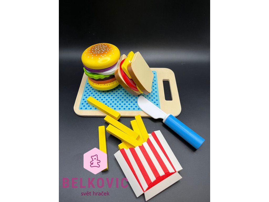 Součástí balení je prkýnko, nůž, hranolky v obalu, housky, maso, zelenina, sýr, vejce a další ingredience pro nekonečnou zábavu. Hra podporuje fantazii, kreativitu i jemnou motoriku.