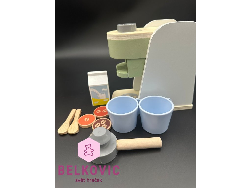 Díky realistickým detailům, jako je otočné tlačítko, páka a dřevěné kapsle, si děti mohou hrát na přípravu espressa i cappuccina. Dva hrnečky, lžičky a balení „mléka“ dotvářejí kompletní kavárenský zážitek.