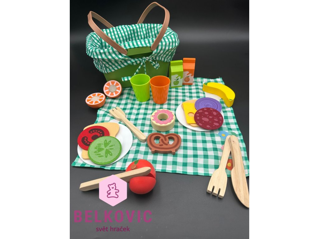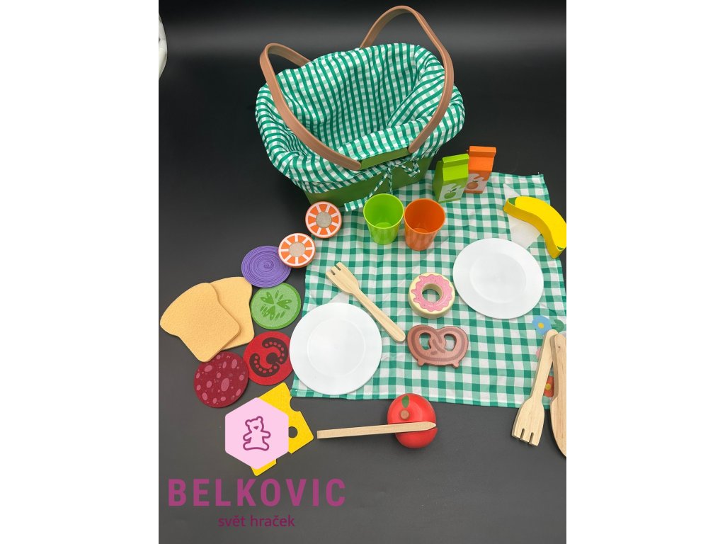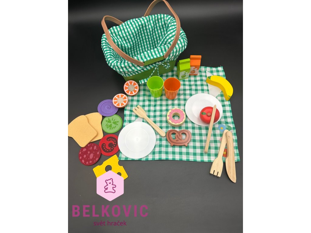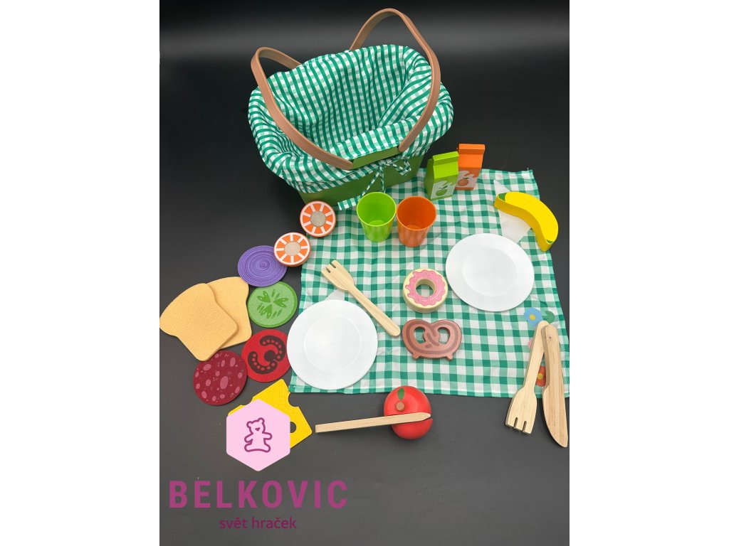 Rozkošná sada pro malé milovníky pikniků! 🧺 Děti si s ní užijí spoustu zábavy při přípravě svačiny, servírování i hraní venku nebo doma. Součástí je košík s látkovou výstelkou, nádobí, dřevěné potraviny i doplňky, které navozují opravdovou piknikovou atmosféru.