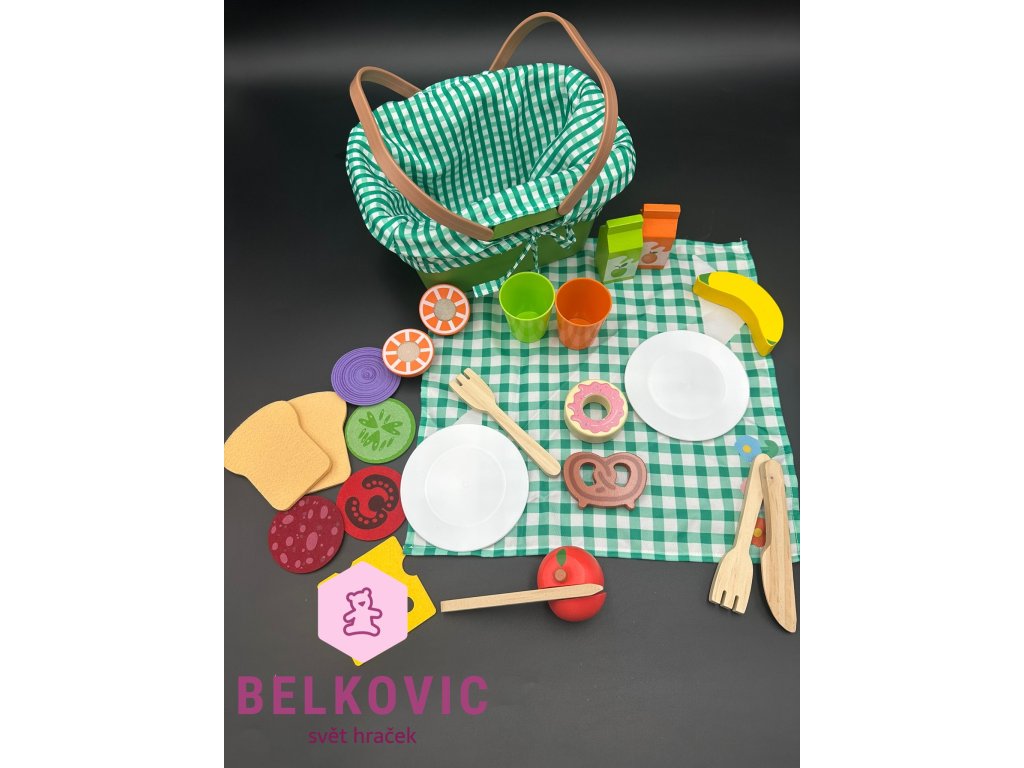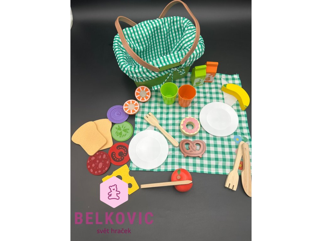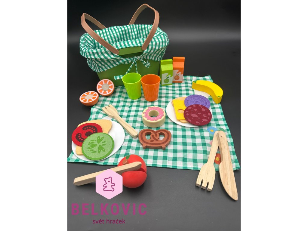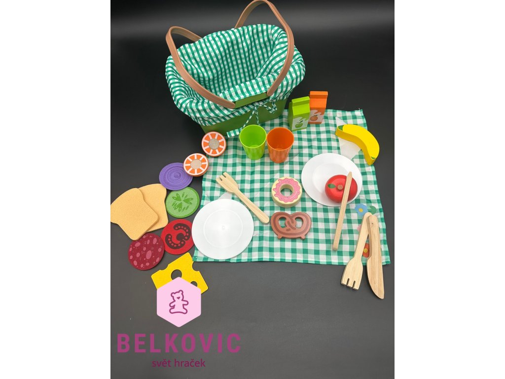 Rozkošná sada pro malé milovníky pikniků! 🧺 Děti si s ní užijí spoustu zábavy při přípravě svačiny, servírování i hraní venku nebo doma. Součástí je košík s látkovou výstelkou, nádobí, dřevěné potraviny i doplňky, které navozují opravdovou piknikovou atmosféru.