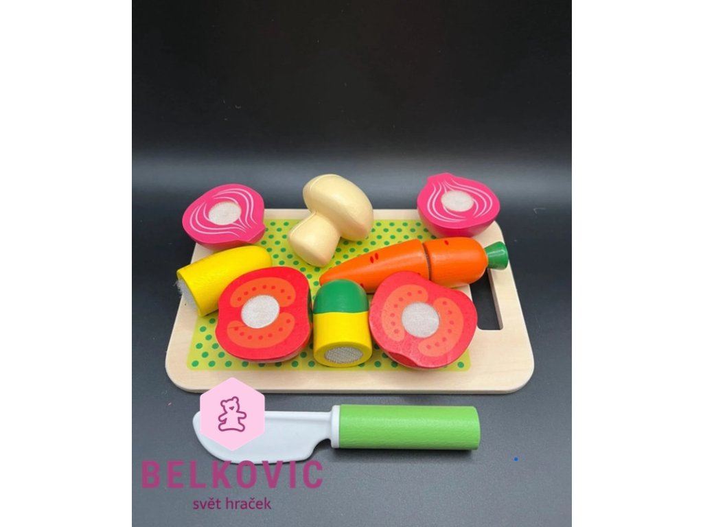 Barevná dřevěná sada zeleniny s prkénkem a nožem přinese dětem spoustu zábavy při hře na kuchaře! Obsahuje oblíbené druhy zeleniny – mrkev, kukuřici, lilek, cibuli, rajče i houbičku, které lze rozdělit a znovu spojit pomocí suchého zipu. Skvělý doplněk pro dětské kuchyňky i obchůdky.