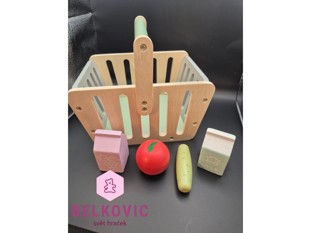 Stylový dřevěný košík pro malé nakupující! 🎁 Děti si s ním mohou hrát na obchod, nakupování nebo domácí kuchyňku a rozvíjet tak fantazii i jemnou motoriku. Součástí je i sada potravin, se kterými si mohou hrát jako dospělí – mléko, jablko, okurka, jogurt a džus.