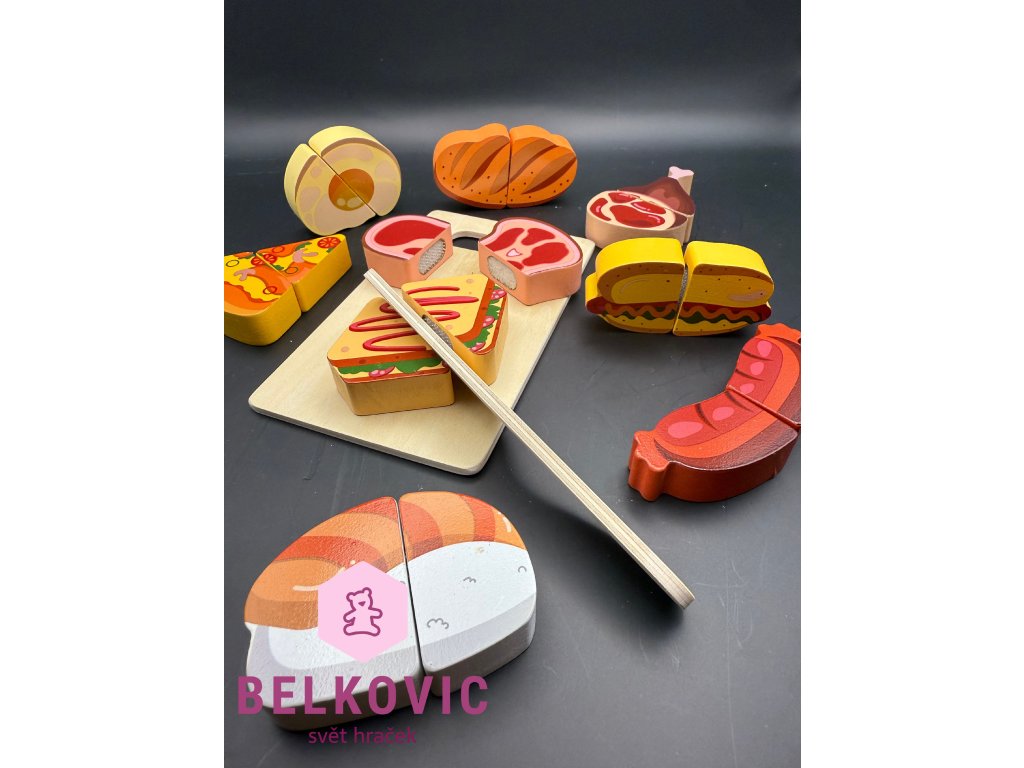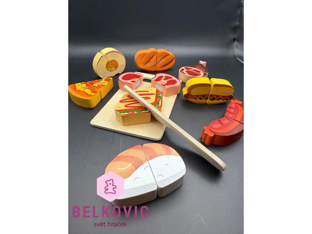 Barevná sada dřevěných potravin, které si děti mohou „ukrojit“ pomocí přiloženého nože a prkénka. Skvělá hračka pro malé kuchaře, kteří rádi pomáhají v kuchyni a rozvíjejí fantazii při hře na vaření.