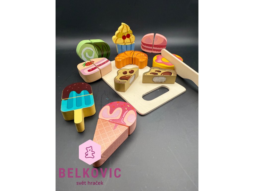 Barevná dřevěná sada s dezerty, která potěší každého malého cukráře! Najdete v ní dortíky, zmrzliny, roládu, croissant i muffiny – vše s krásným potiskem a spojeno suchým zipem, takže se dá „krájet“ přiloženým dřevěným nožem.