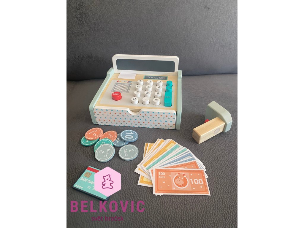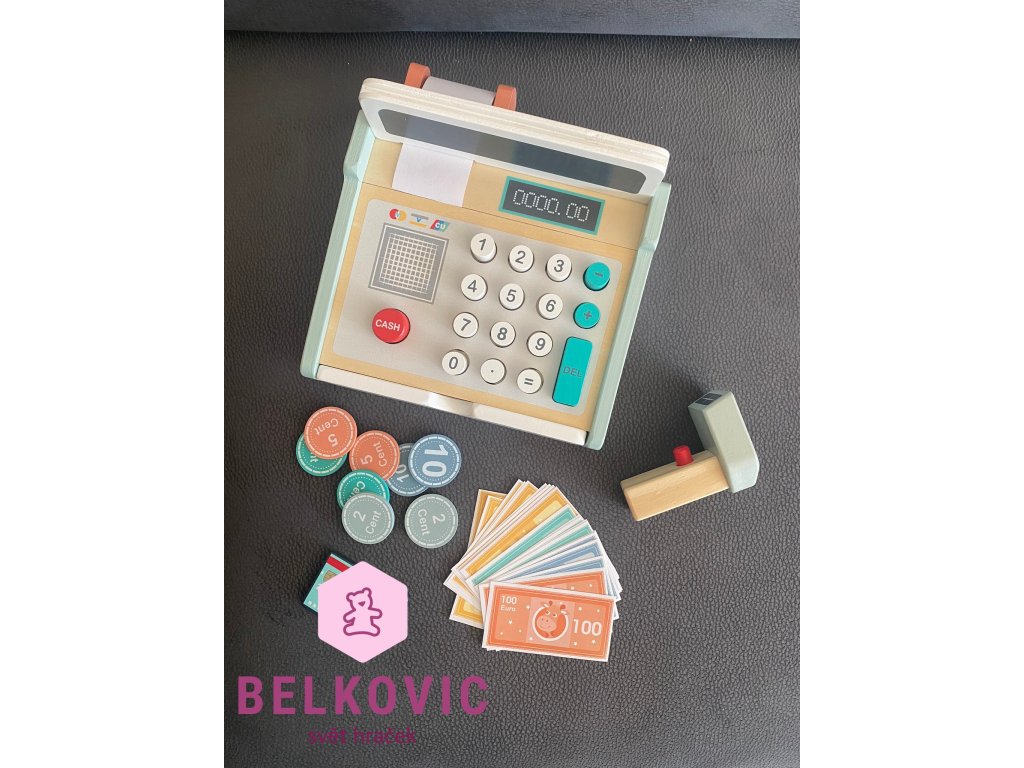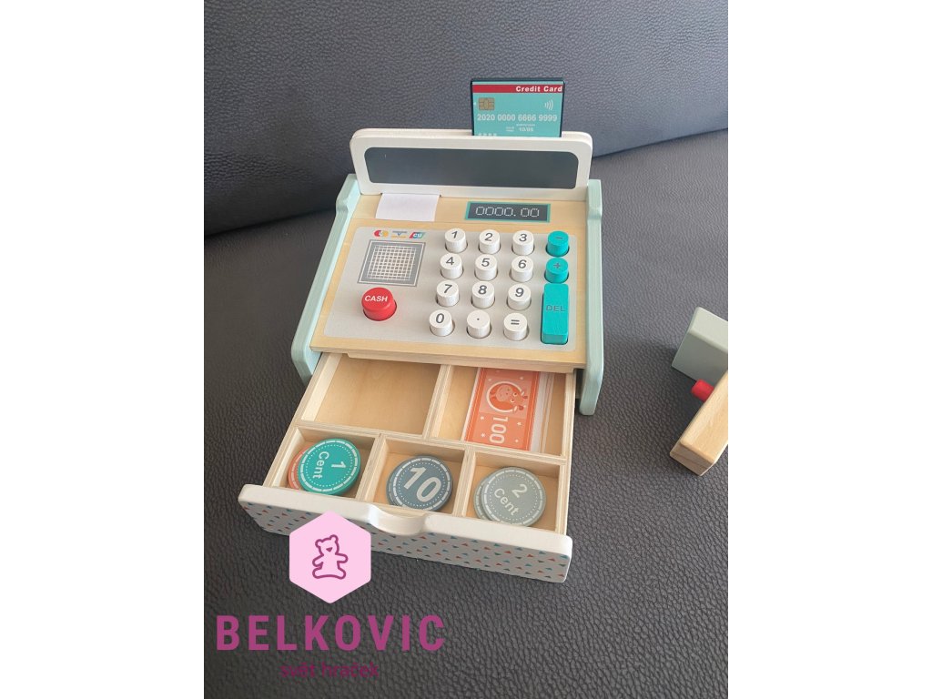 Součástí je také ruční dřevěný skener, platební karty, bankovky a sada dřevěných mincí. Hračka tak rozvíjí nejen představivost, ale i základní počítání, motoriku a sociální dovednosti, když si děti mezi sebou hrají na nakupování.