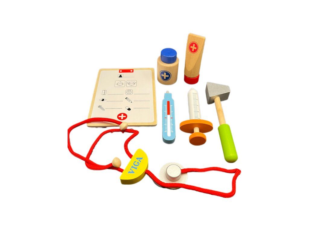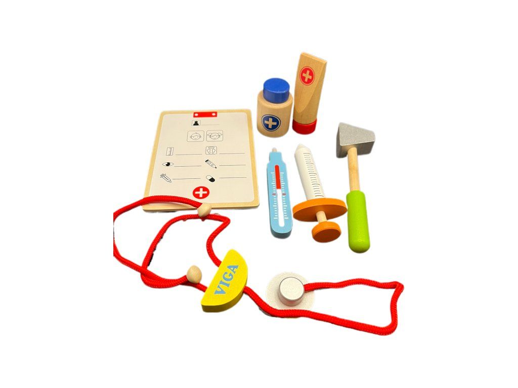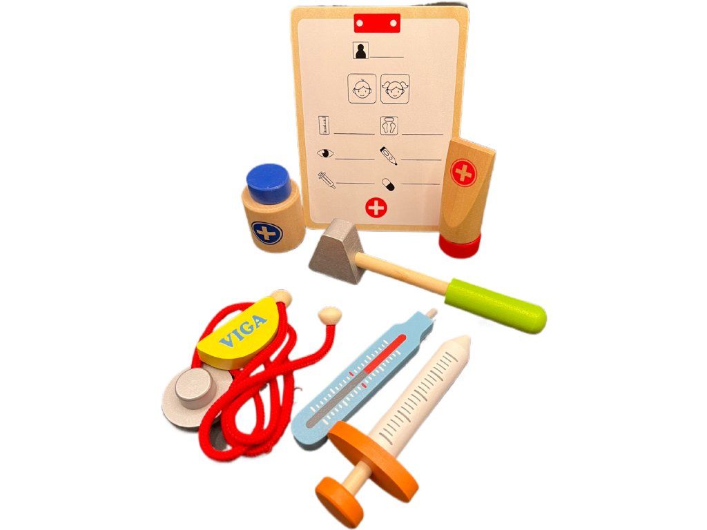 🌳 Poctivé dřevěné doplňky: Teploměr, stetoskop i funkční injekce – vše z hladkého přírodního dřeva, které je příjemné do ruky a vydrží roky.