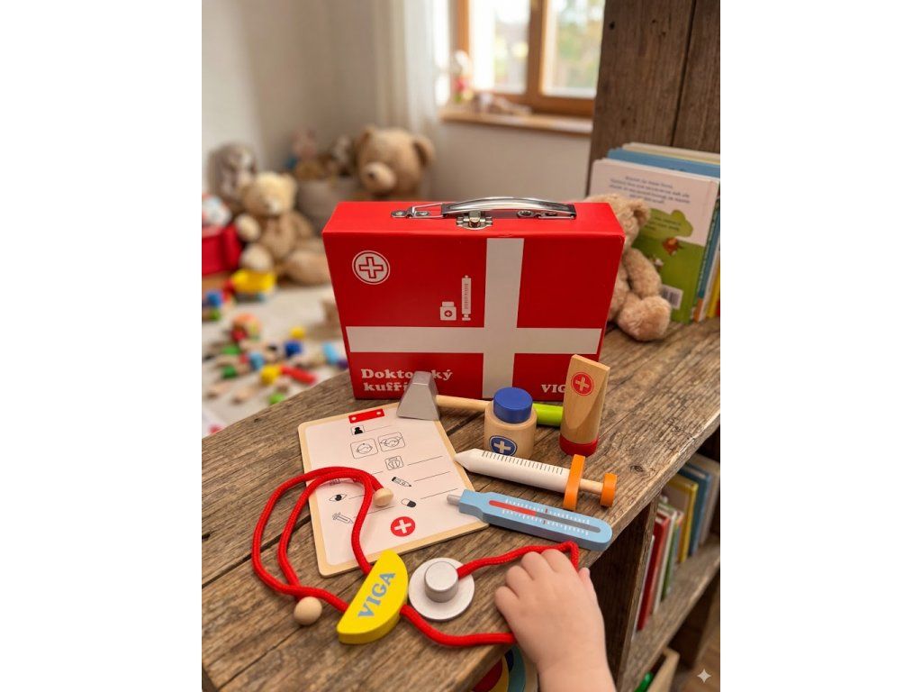 Proč koupit u nás: U nás doma vedou hračky, které dětem nedávají jasný návod, ale nechají je tvořit vlastní svět. Tenhle doktorský set je přesně takový. Naše dcera s ním nejdřív ošetřovala všechny panenky a teď už preventivně vyšetřuje i nás. Kufřík z tvrdého kartonu je skvělý v tom, že když s ním malá někde omylem klepne, nezanechá to stopu na nábytku, a hlavně se jí lehce nosí. Nářadí uvnitř je ale poctivý kus dřeva, co fakt vydrží i to nejnáročnější nasazení v terénu. Nejvíc nás baví ta stříkačka s pružinou – ta má u nás v ordinaci největší úspěch a pomohla nám vysvětlit, že injekce u paní doktorky není žádný strašák.