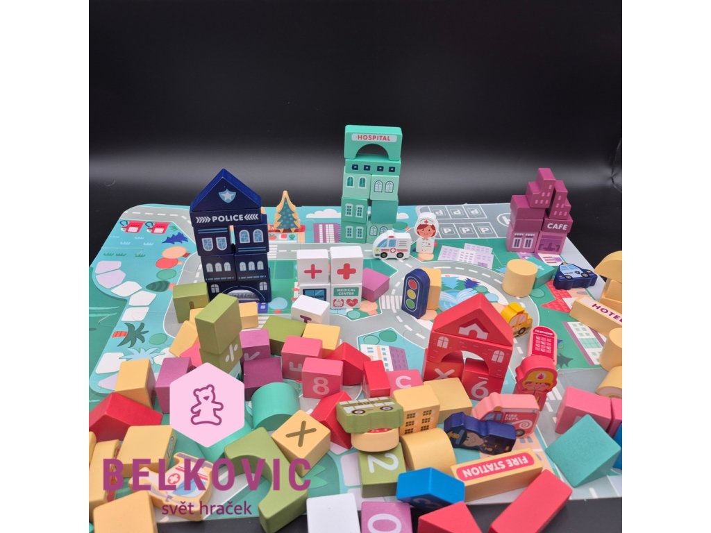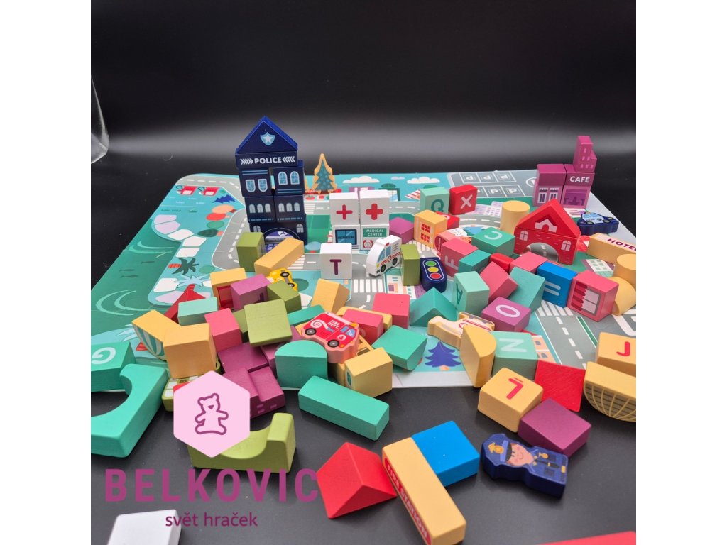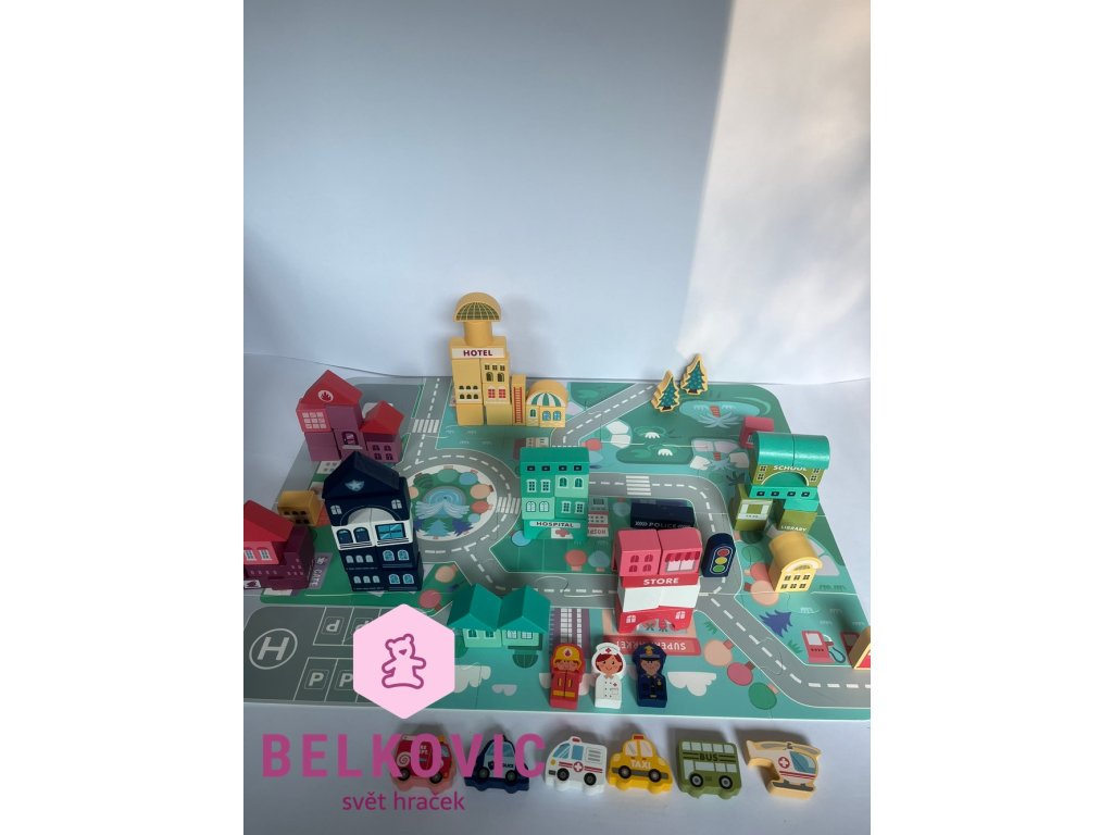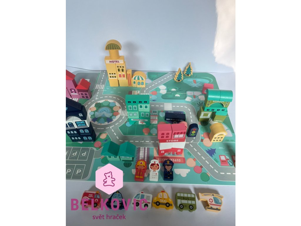 Tahle nádherná sada dřevěného města promění každou hru v dobrodružství! Děti si mohou postavit vlastní ulice, nemocnici, hotel, obchody i školu a k tomu využít barevná dřevěná autíčka, dopravní značky a stromy. Celé město se skládá na herní podložku s vyznačenými cestami, takže je hned připravené k ježdění i stavění.