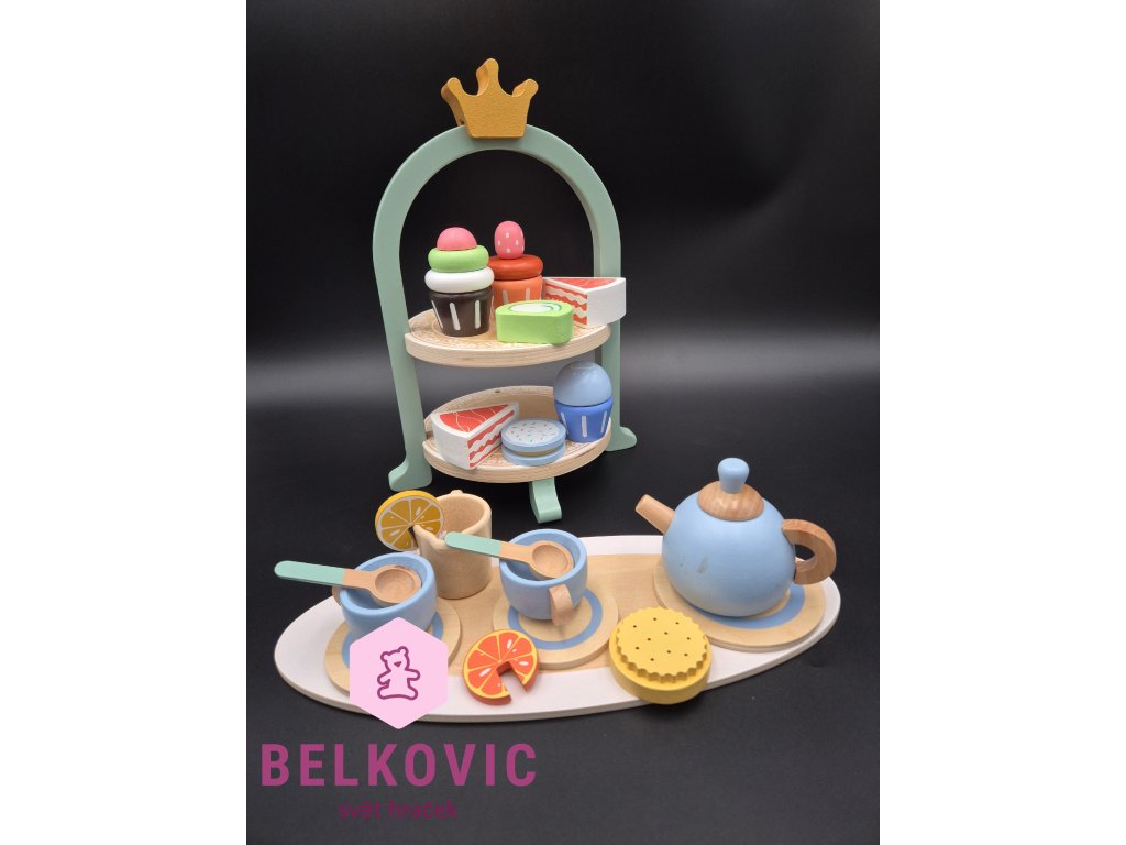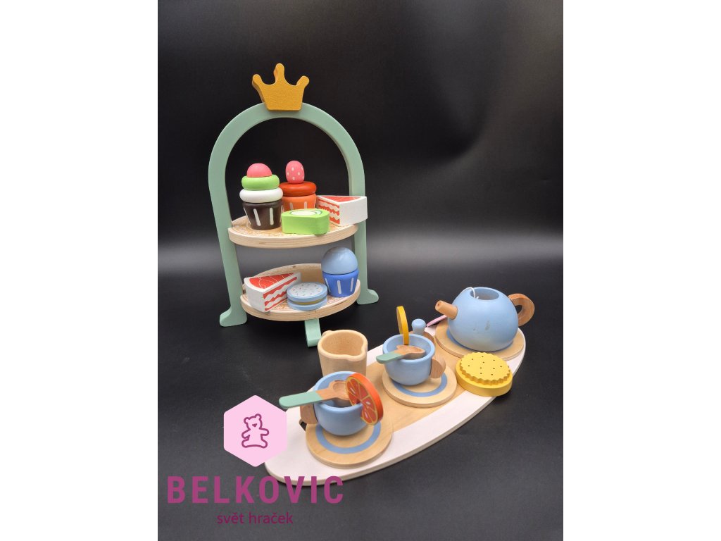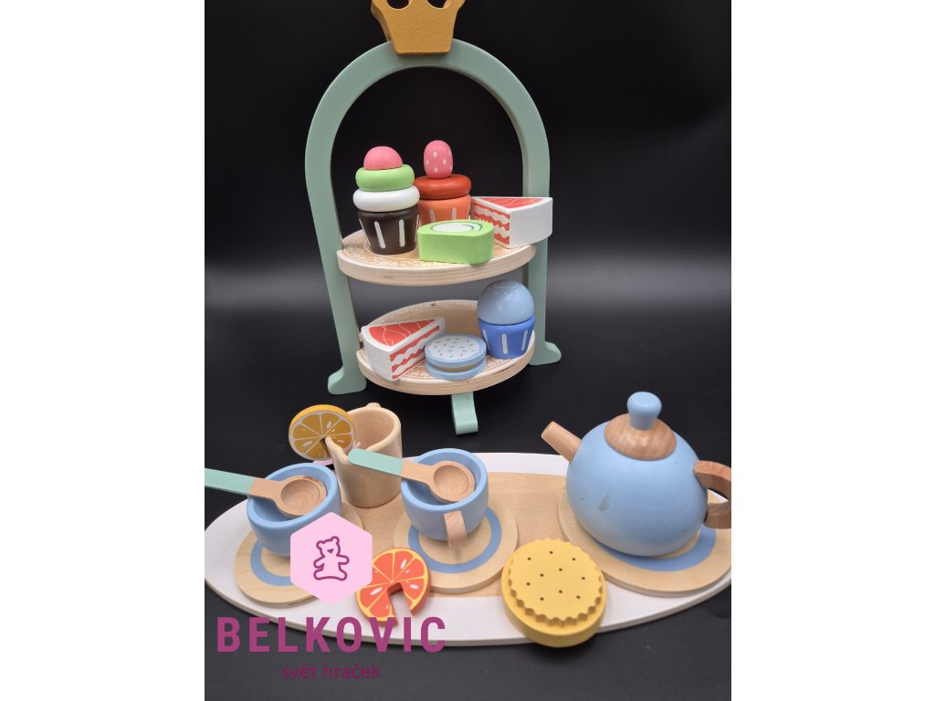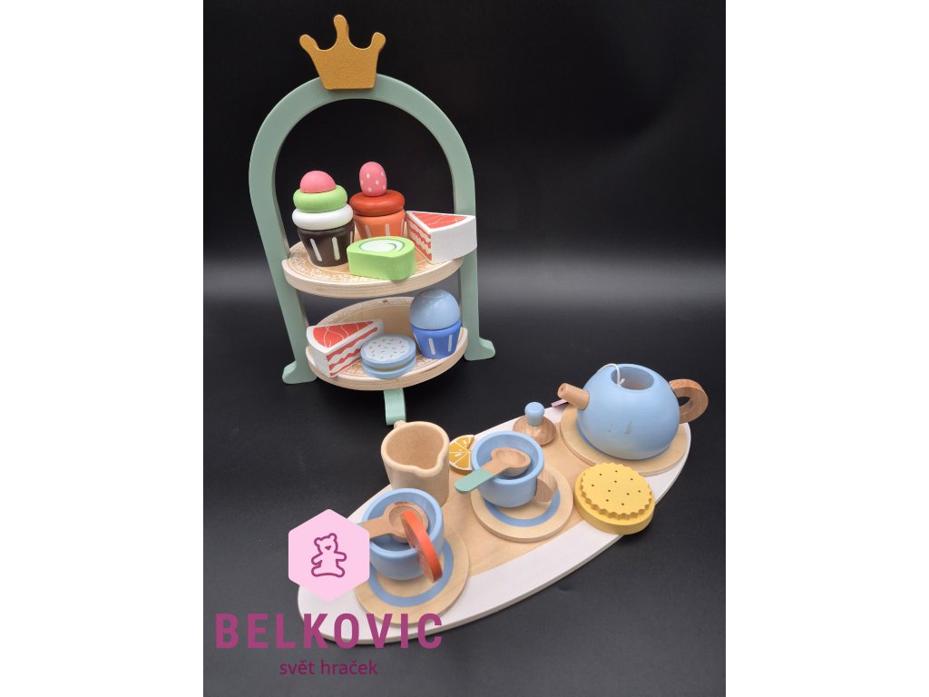 Kouzelný dřevěný set, který promění každý dětský pokojíček v malou kavárnu nebo čajový salón! Na dvoupatrovém podnose s korunkou čekají barevné dortíky, cupcaky a zákusky, zatímco na tácu s konvičkou a hrníčky se servíruje čaj s citronem a sušenkami. Ideální hračka pro společné chvíle, rozvoj fantazie a jemné motoriky.