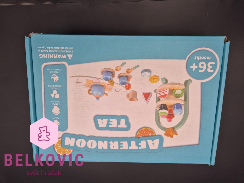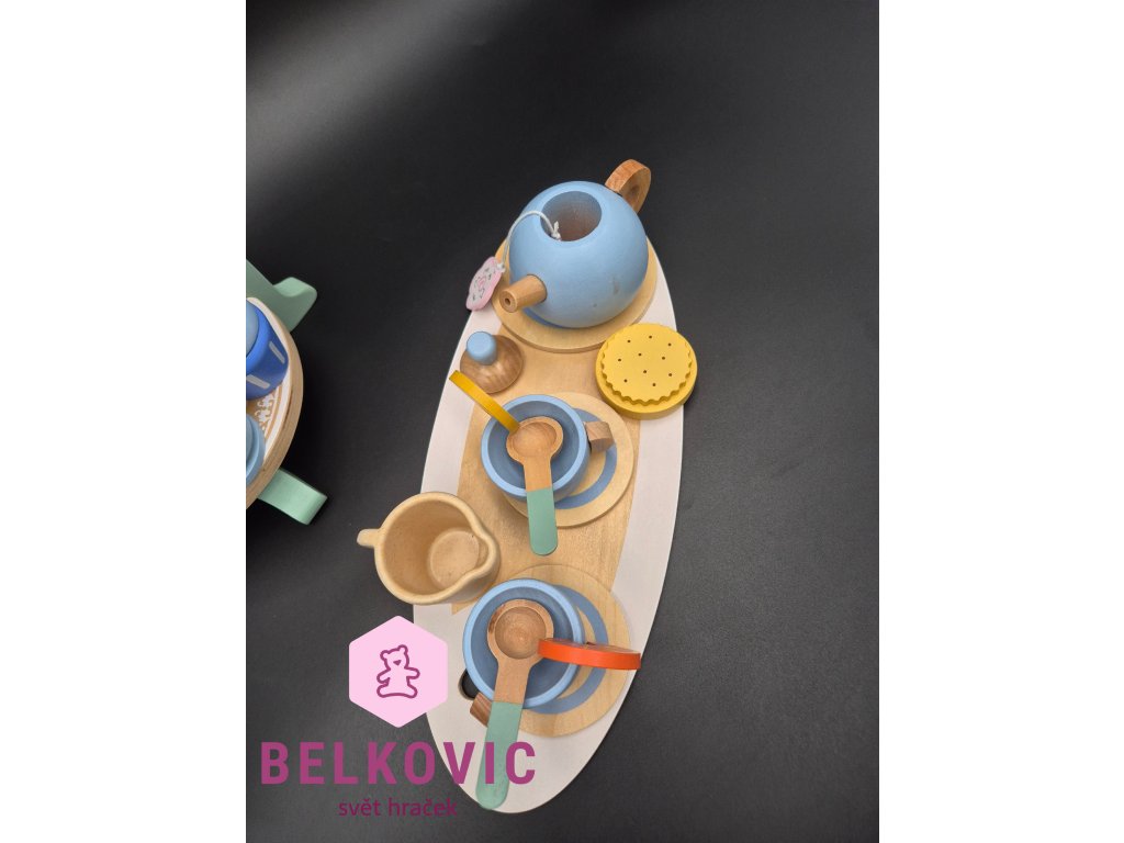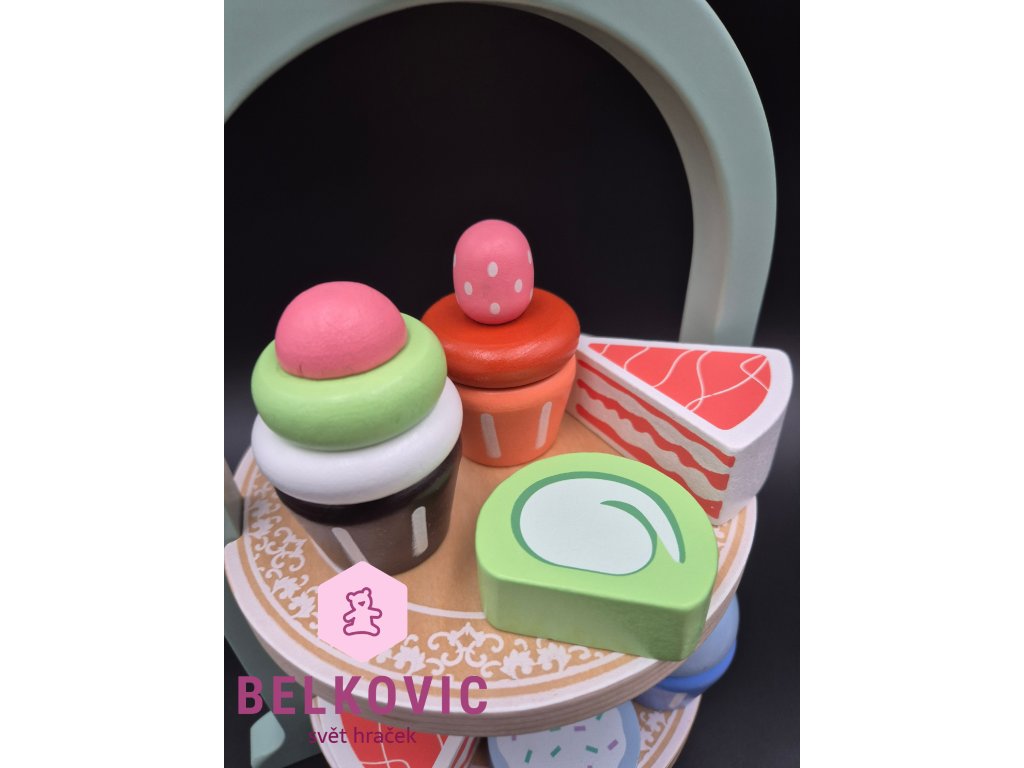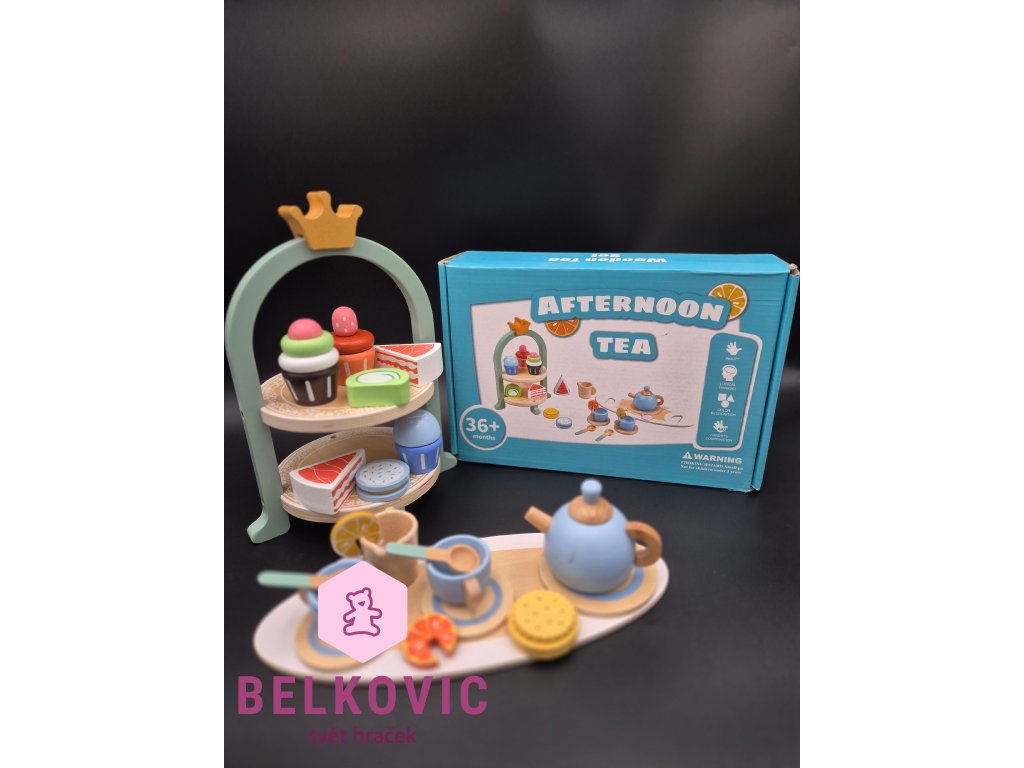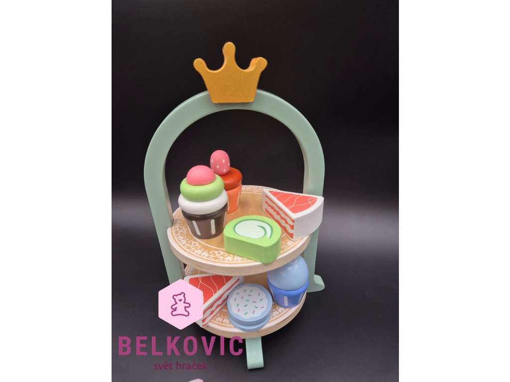 Kouzelný dřevěný set, který promění každý dětský pokojíček v malou kavárnu nebo čajový salón! Na dvoupatrovém podnose s korunkou čekají barevné dortíky, cupcaky a zákusky, zatímco na tácu s konvičkou a hrníčky se servíruje čaj s citronem a sušenkami. Ideální hračka pro společné chvíle, rozvoj fantazie a jemné motoriky.