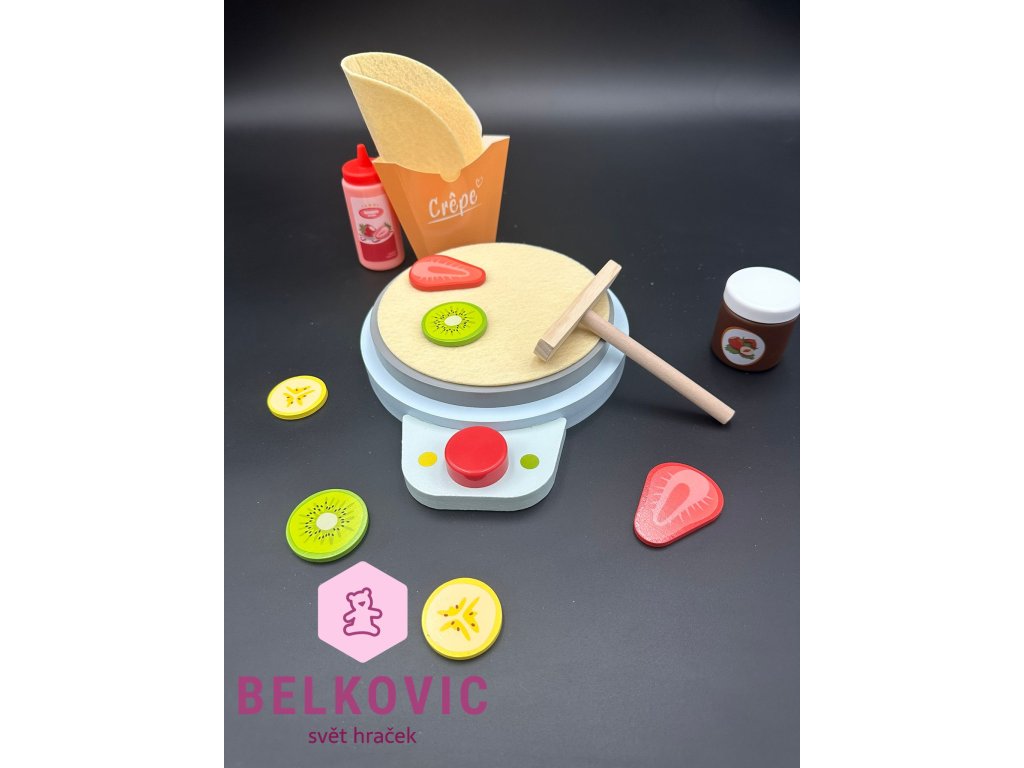 Tahle krásná sada potěší všechny malé kuchaře! Děti si mohou samy připravit lahodné palačinky s ovocem, čokoládou a sirupem. Díky dřevěným dílkům a plstěným palačinkám působí hra velmi realisticky a podporuje dětskou fantazii i jemnou motoriku.