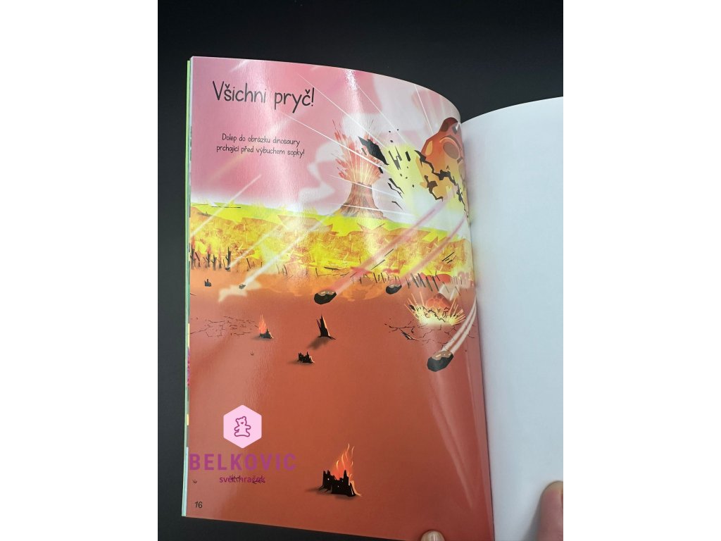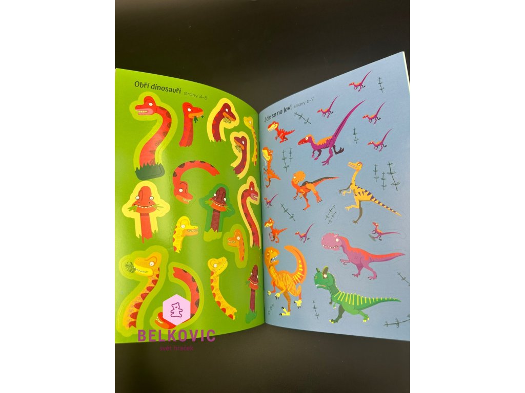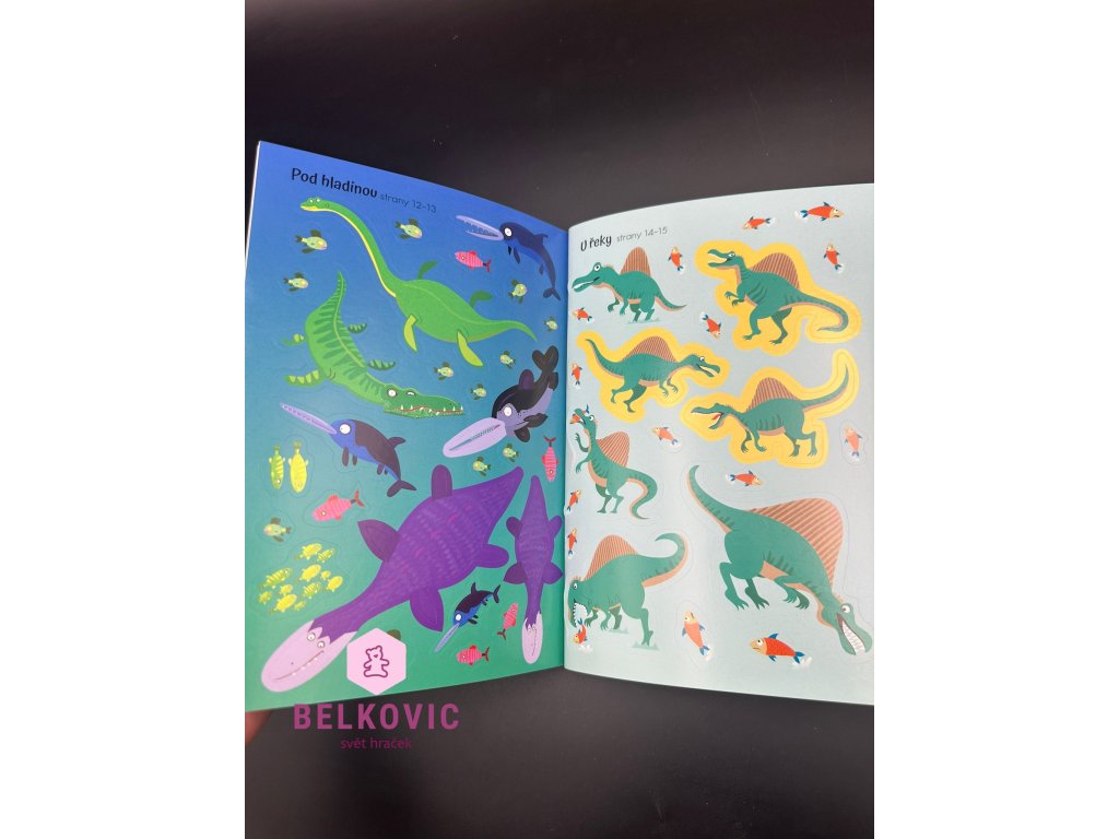 Tato krásně ilustrovaná samolepková knížka vezme děti do pravěkého světa plného dinosaurů, sopky, řek i tajemných hlubin. Najdou v ní více než 200 znovupoužitelných samolepek, díky nimž si mohou samy dotvářet scény a tvořit vlastní příběhy. Každá stránka představuje jiné prostředí – od lovu, přes řeku, až po dramatický útěk před výbuchem sopky.