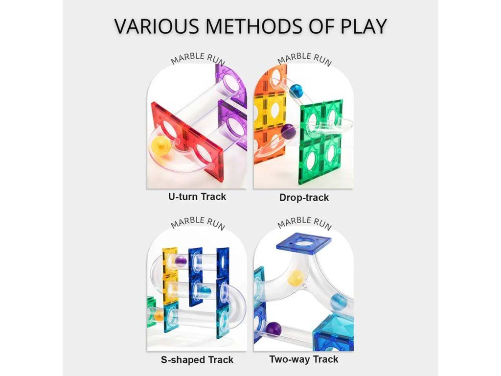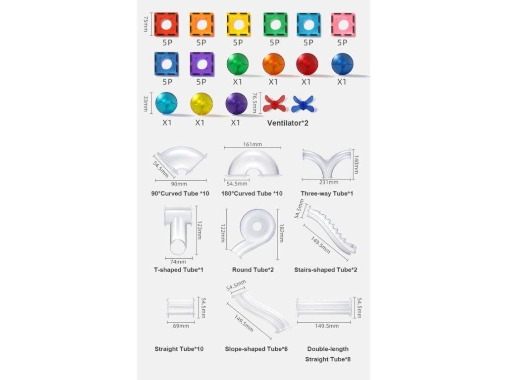 Obsah balení: 40x čtvercový dílek s dírkou, 7x barevná kulička, 2x pohyblivý větrák, 10x zatáčka 90°, 10x zatáčka 180°, 1x rozdvojka, 1x díl T, 2x kulatý díl, 2x schody, 10x rovný díl, 6x skluzavka, 8x dlouhý rovný díl,