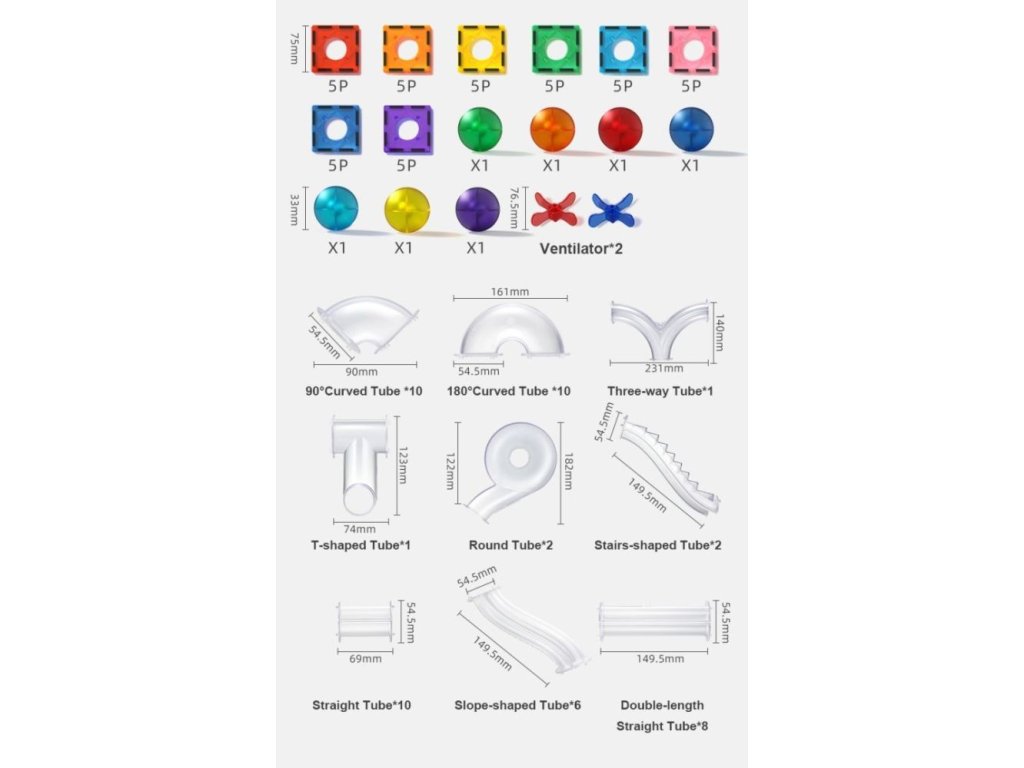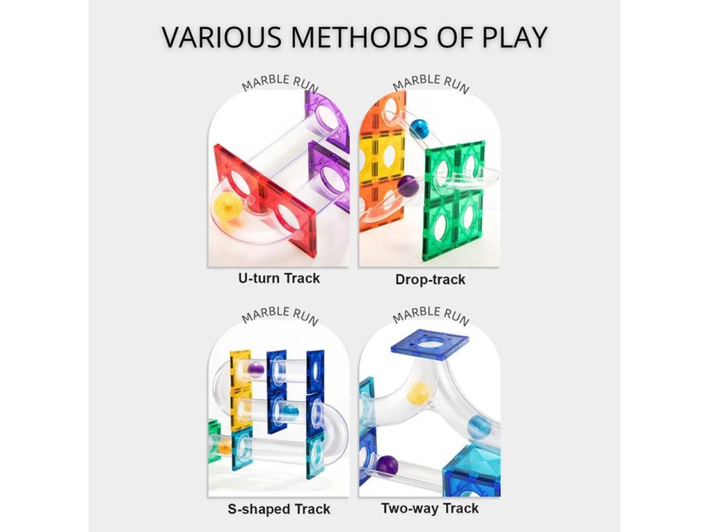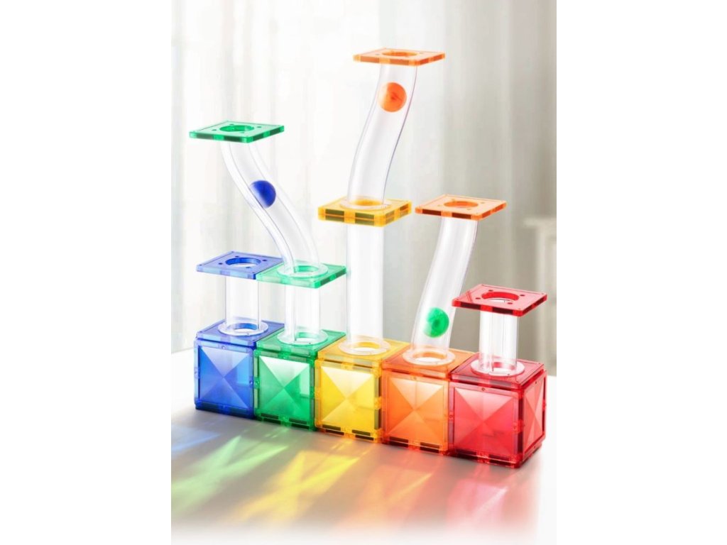 Tato rozsáhlá sada magnetické stavebnice Mideer kombinuje klasické barevné magnetické dílky s prvky kuličkové dráhy (Marble Run). Děti mohou stavět domy, věže, mosty i složité konstrukce a zároveň vytvářet dráhy, po kterých se kuličky pohybují různými směry. Hra je pokaždé jiná a přirozeně motivuje k objevování a zkoušení nových nápadů.