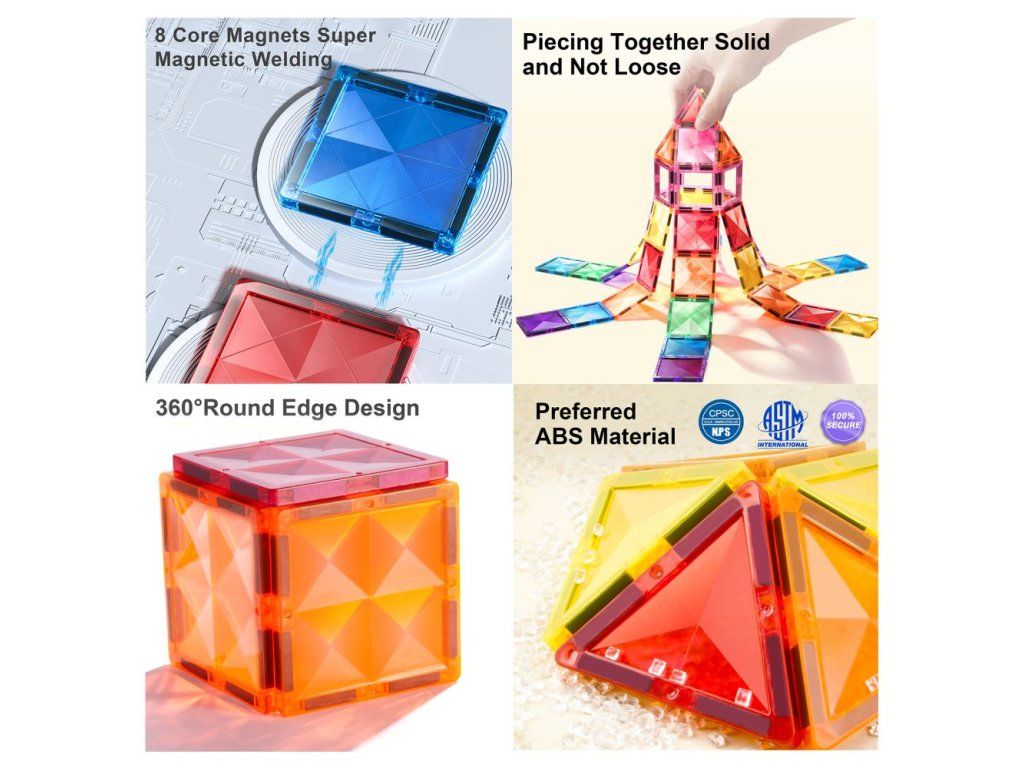 Sada je navržena tak, aby nabízela maximální variabilitu při stavění. Kromě klasických čtverců a několika druhů trojúhelníků v ní najdete i speciální díly s úhlem 90 stupňů a dva podvozky s kolečky. To znamená, že tvoření nekončí u statických budov – děti mohou konstruovat funkční auta, kamiony nebo pohyblivé stroje. Všechny dílky jsou vyrobeny z odolného ABS plastu a uzavřeny ultrasonickým svárem, což zaručuje bezpečí i při pořádném stavitelském zápalu.