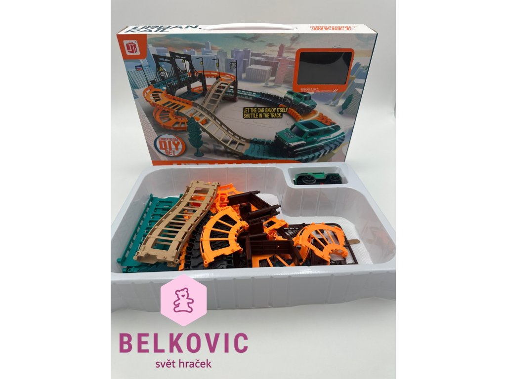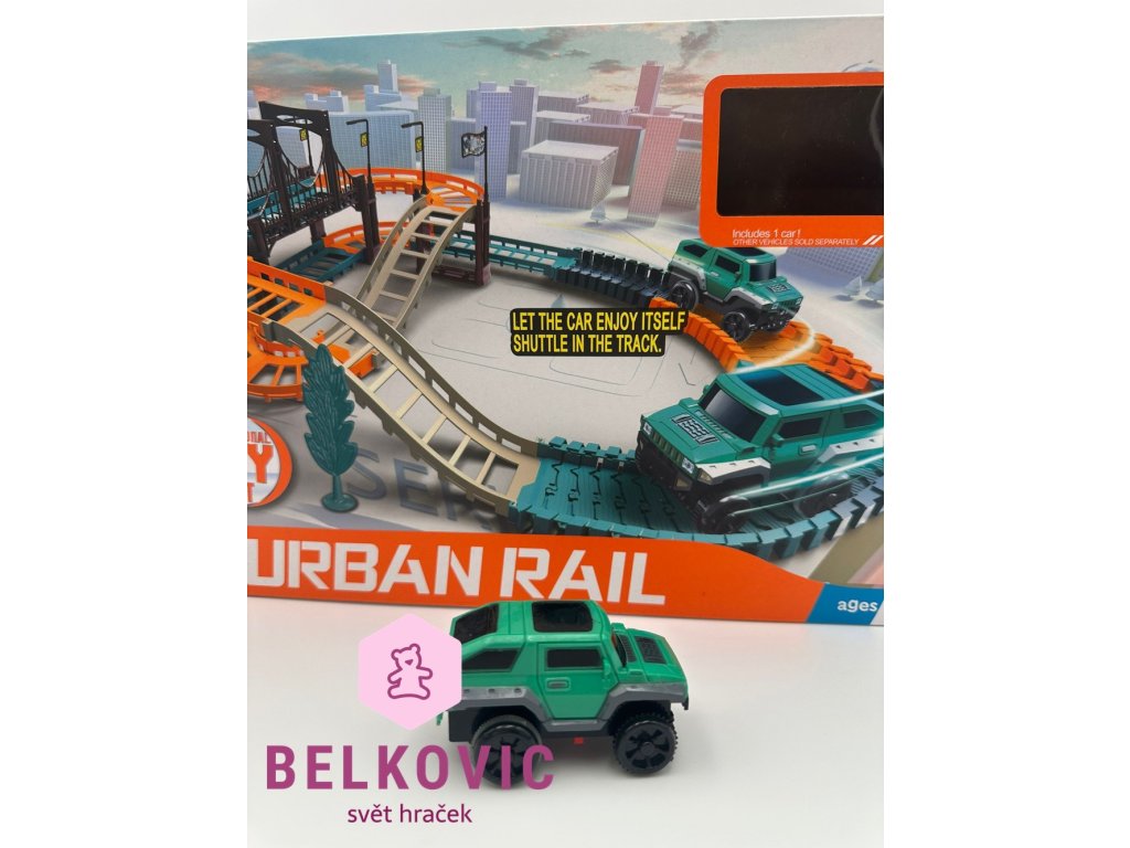 Tahle parádní závodní dráha Urban Rail přináší dětem opravdové dobrodružství – mosty, klopené zatáčky, stoupání, klesání a hlavně terénní autíčko, které si hravě poradí s celou trasou. Díky výrazným barvám a variabilním dílkům působí sestavená dráha jako malý městský okruh, který děti okamžitě vtáhne do hry.