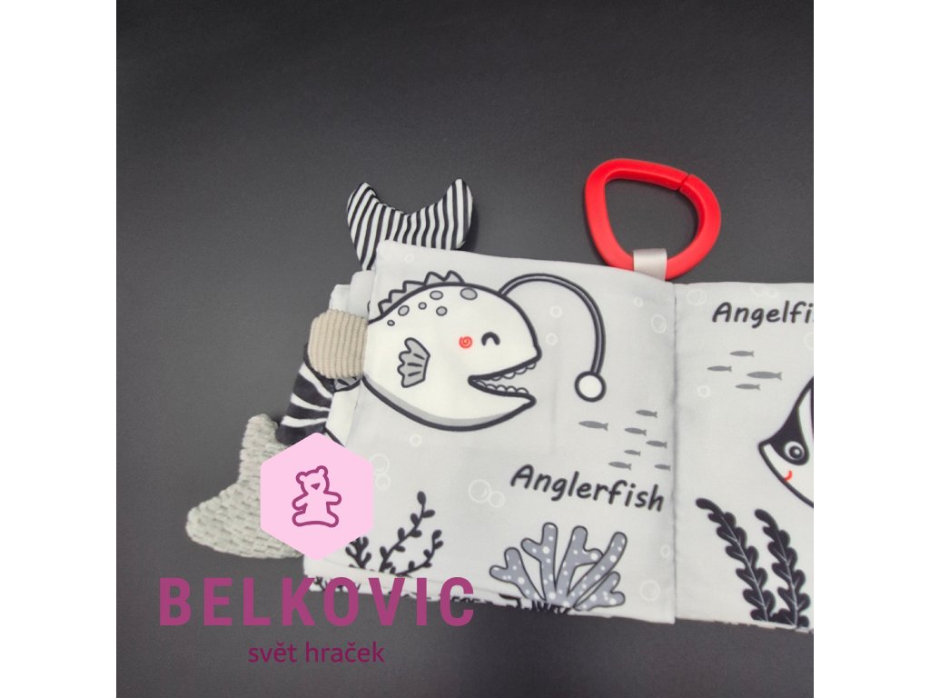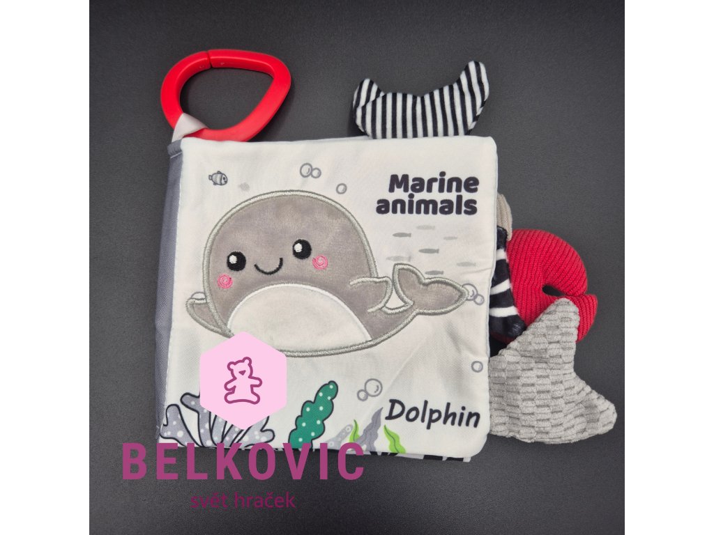 Díky černobílým a jemně barevným ilustracím si ji miminko užije i v prvních měsících, kdy kontrast nejlépe vidí. Obsahuje jednoduché motivy – delfína, tuleně, želvičku a další – které pomáhají dítěti rozpoznávat tvary, pohyb a obličeje. Textury na okrajích přirozeně podporují rozvoj hmatu a jemné motoriky.