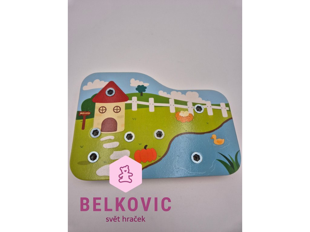 Tahle krásná interaktivní sada je ideální pro malé kutily a děti, které milují farmaření a tvoření. Na pevné dřevěné desce je vyobrazen statek s jezírkem, dýněmi i plotem a k tomu sada barevných dřevěných prvků – traktor, kačenka, větrný mlýn, strašák i kbelík od kravičky. Každý díl má otvor pro šroubek a děti si ho samy připevňují pomocí přiloženého nářadí.