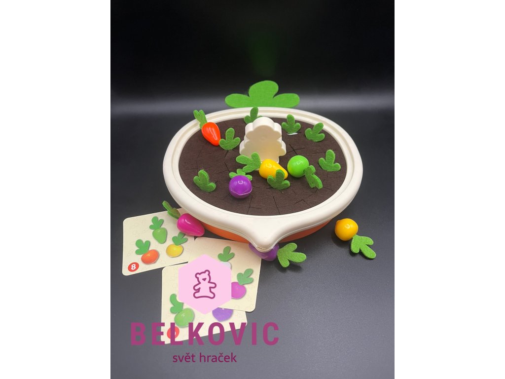 Hra dětem nabízí možnost kombinovat barvy, třídit zeleninu, přiřazovat ji ke kartičkám se zadáním a hrát jednoduché úkolové hry. Pevné plastové dílky, filcové lístky a stabilní základna jsou ideální i pro menší děti – krásně se drží a snadno se vytahují i vracejí zpátky.